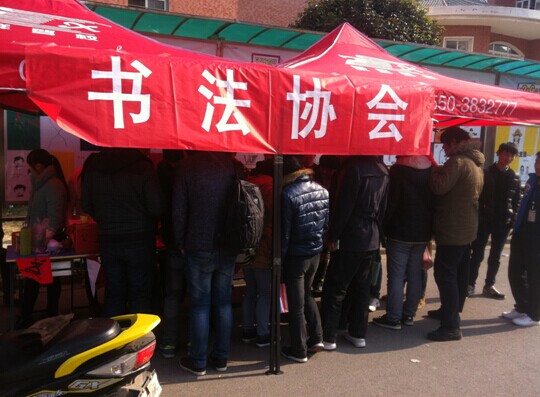 活动开始不久,参观的学生越来越多,热闹非凡、人头撺动,同学们游览在现场四周挂满的书画作品中。2014年12月26日—30日,书法协会又在女生宿舍一号楼下进行了春联送回工作。一排书桌画案当中摆开,几位书协同学现场挥笔,送春联,写对联,同学们兴高采烈,奔走相告,争先恐后,花1元钱挑选自己喜爱的作品,拿到对联作品的同学无不欢欣鼓舞。很多同学在前期的活动中报了名,也来到了现场领取自己的春联。活动现场书协的成员们详细的向同学们介绍了此次的活动公益性,不少同学听完以后觉得花这1元钱很值,都点头称赞。