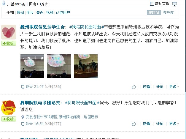 不知不觉2个小时很快就过去,活动现场一直高潮不断。本次活动还引用了新媒体技术,在腾讯微博开辟#我与院长面对面#话题专栏,得到很多同学的热情响应,截至活动结束,共引发了相关话题讨论495条,阅读量达13万次。同学们都感到受益匪浅,纷纷表示:“今天是第一次与校长这么近距离的接触,感觉挺亲切的。”,“能够有机会与校长‘面对面’交流,说出自己的心声,我真的觉得很荣幸!”,“以前觉得领导开会很形式,听着听着就晕乎乎的,但这次不一样,李院长谈到的都是与我们学生息息相关的,希望学院能常举办这样的活动。”。