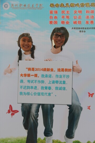 10月8日一早,太阳集团tyc97282014级新生在结束为期两周的军训后,开始了他们大学的第一课。当新生们路过教学楼时,惊喜的发现院团委的老师们给新生准备的开学第一课“礼物”——核心价值观代言墙。两个打扮青春的人偶矗立在教学楼入口处,上面清晰的标注着社会主义核心价值观“富强、民主、文明、和谐;自由、平等、公正、法治;爱国、敬业、诚信、友善”。