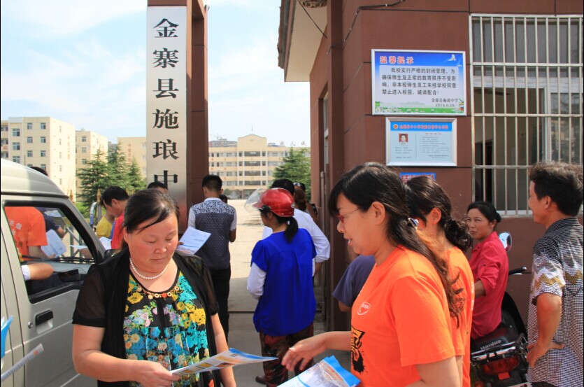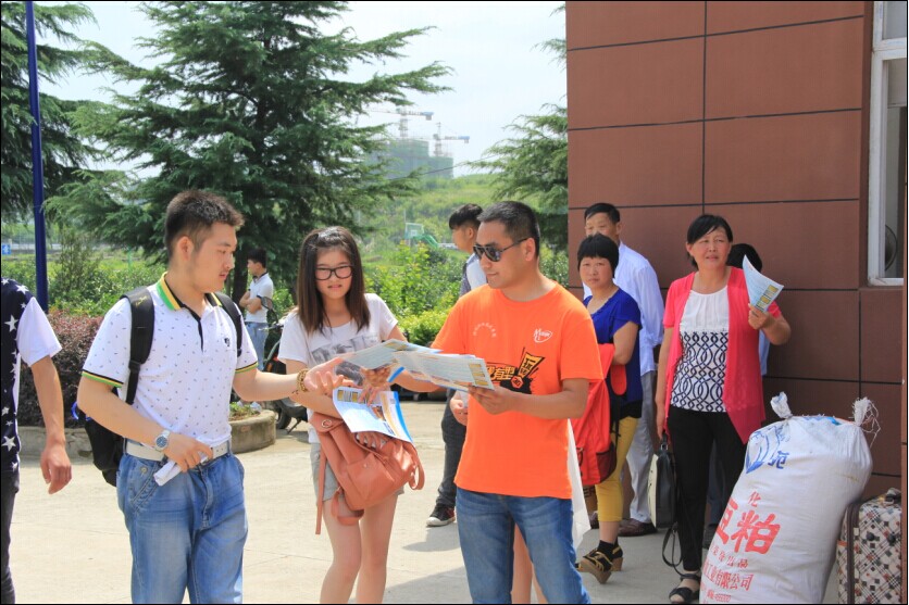 7月3日上午,太阳集团tyc9728院级重点团队暨技师学院国家重点社会实践团队在团委副书记刘杰、程诚,技师学院团总支书记张婷婷、食品系团总支书记张功会的带领下先后来到金寨县一中、施琅中学、职业教育中心等学校进行招生宣传工作。