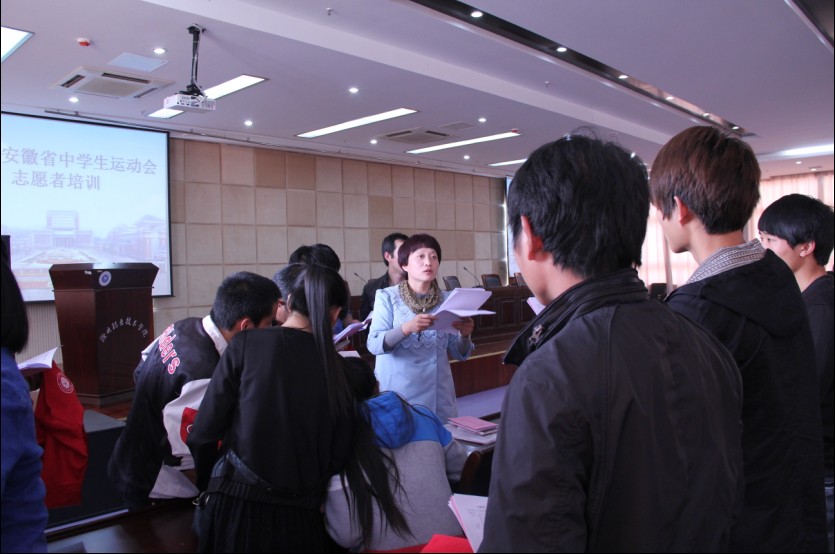 2014年4月3日15:00,在学院综合楼五楼报告厅举行了安徽省中学生田径运动会青年志愿者培训会。参加此次活动的有市教育局、团市委等相关领导。会议由院团委书记王蓓蓓主持活动。