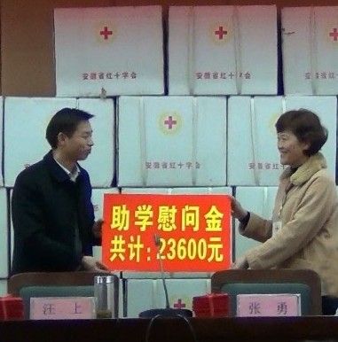 捐赠仪式上,我院红十字会会长汪上接收了滁州市红十字会对我院的助学慰问金共计23600元,并为全院59名受助贫困生发放慰问品。随后受助贫困生的代表向全体师生表达了自己深深地谢意,他表示在未来的日子里将会更加努力的学习工作,用自己的实际行动来回报红十字会给予他的帮助。紧接着滁州市红十字会常务副会长胡明英简单介绍了滁州市红十字会“博爱在皖东”项目及对我院红会发展的了解情况,提出要将公益活动继续发扬下去,使得更多的学生能得到红十字会的帮助。