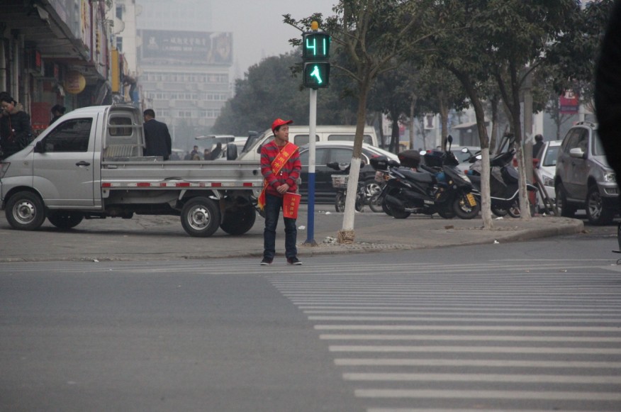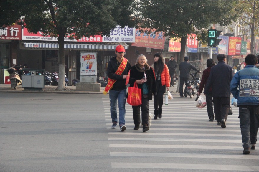 青年志愿者们站在执勤路口,向过往行人进行交通安全常识宣传,劝导机动车及非机动车不要闯红灯,引导行人走斑马线,主动搀扶和帮助行动不便的老人过马路。寒冷的天气把他们的手指冻的通红。气温不断下降,但他们的热情丝毫不减,在拥挤的交通道路口,回响着一句句劝诫提醒的话语,“请不要闯红灯”、“请不要乱穿马路”、“人车高峰,注意安全”。来往的车辆因为他们及时的疏散而变得更加通畅,他们一丝不苟的工作态度、良好的精神面貌和文明素养受到交警们和过往行人的高度评价,不少违规违章者受到志愿者精神的感染,表示今后一定遵守交通规则。