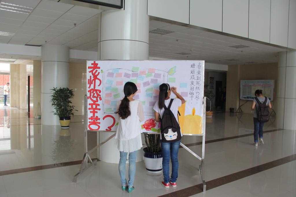 许多同学在院学生会宣传部制作的教师节海报上写下了他们对老师感谢的心语。“敬师小语”卡制作完成后被贴放在展板上,为校园增添了一道亮丽的风景线。
