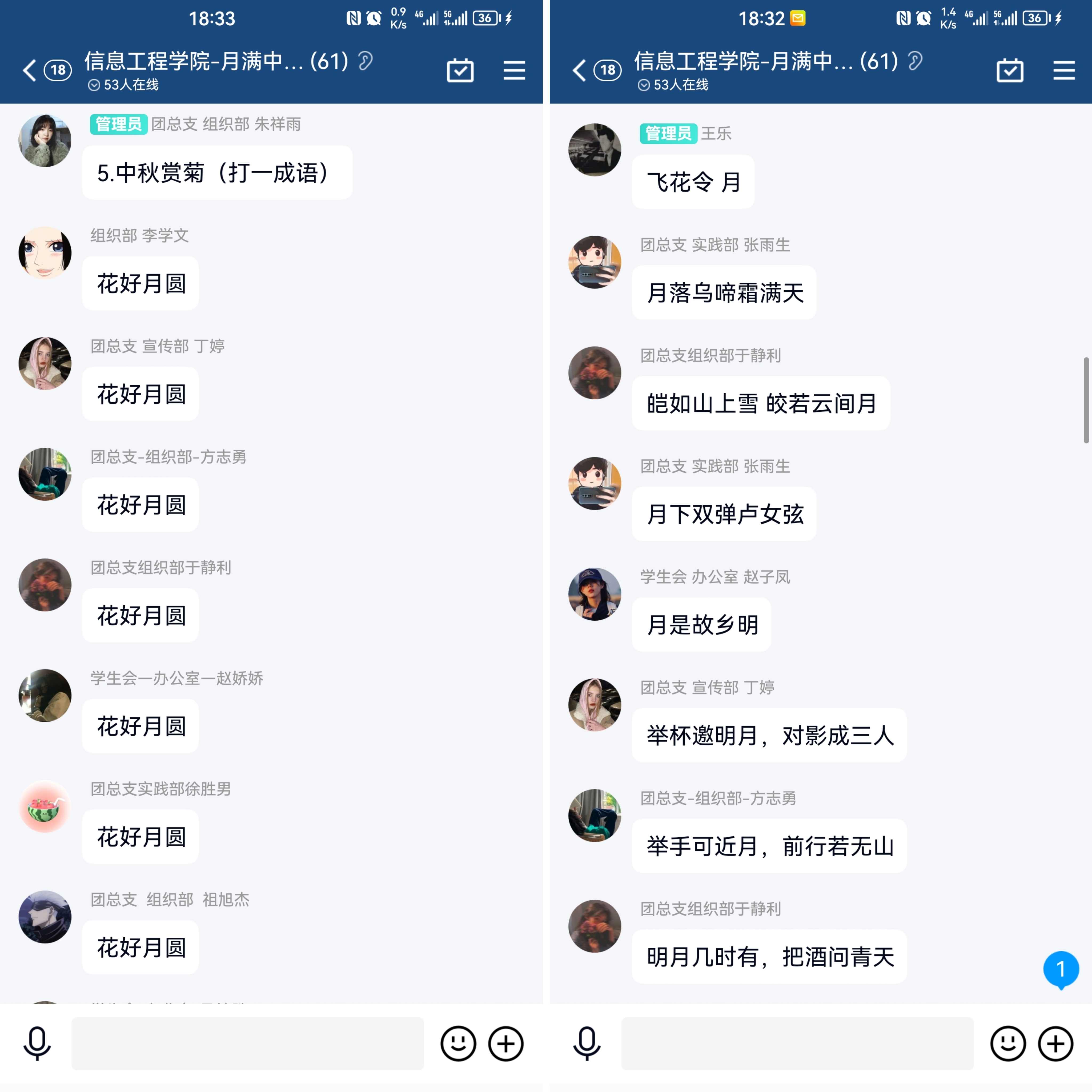 活动中,在猜灯谜抢答环节中由主持人朱祥雨介绍了游戏规则,赛程采取积分制,每道谜题以出示、竞猜、公布谜底为流程有序进行。大家纷纷运用灵活的脑速与敏捷的手速进行抢答,灯谜竞猜场面一度堪比“秒杀活动”。猜灯谜结束后就到了飞花令环节,同学们热火朝天的在线上讨论关于月的诗词,场面非常热闹。活动最后,同学们一起线上观看了中秋晚会并交流了活动心得。