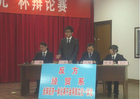 决赛双方分别来自经贸系和机电系。双方就“经济全球化能否导致文化一体化”展开了激烈的辩论。双方一开始就各抒己见,唇枪舌战,随着秒针的转动,比赛也不断的升温。特别是自由辩论环节,双方针锋相对,妙语连珠。正方机电系语言流畅,富于感染力。反方经贸系也不甘示弱,他们辩驳有力,有理有据。双方你来我往,思维的碰撞产生智慧的火花,思辨博学的精神通过火花的热力,传给了场下的每一位观众,赢得了阵阵掌声与喝彩。辩论结束后,胡兆胜老师对本场辩论赛作了细致的评论。反方经贸系赢得了本次比赛,反方二辩也以流畅清晰的表达和落落大方的姿态语言获得了本次比赛的最佳辩手。