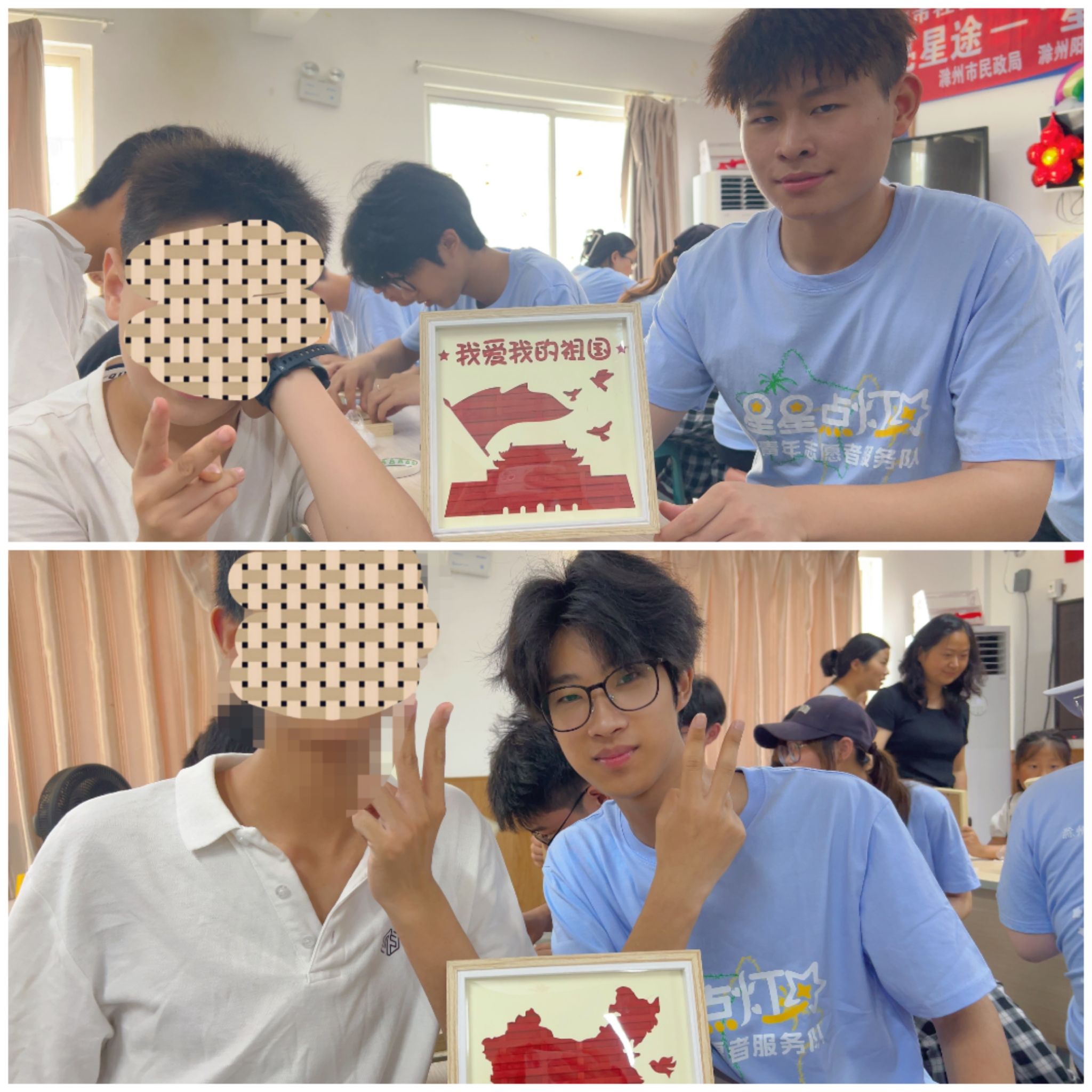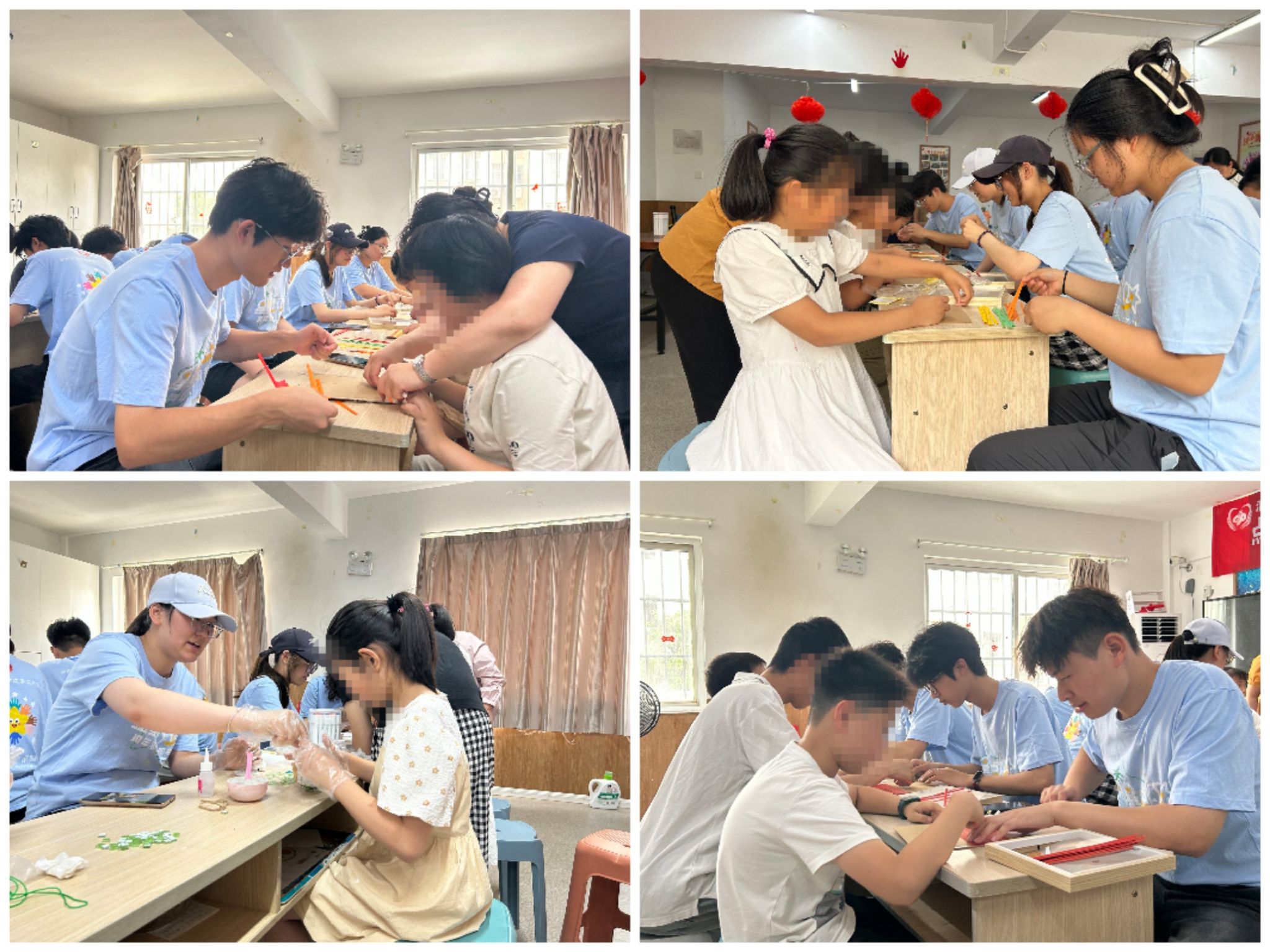 活动现场,志愿者们精心准备了竹编画手工材料和马赛克花瓶制作套件。这些色彩斑斓、充满趣味的手工材料瞬间吸引了孩子们的目光,激发了他们的好奇心和参与热情。在志愿者耐心细致的讲解和示范下,孩子们纷纷拿起材料,开始了自己的创作之旅。尽管他们的动作或许不够娴熟,但每一个专注的眼神、每一次认真的尝试,都让人感受到他们对活动的投入和对美的追求。志愿者们则在一旁悉心协助,时而轻声指导,时而给予鼓励,用温暖的话语和贴心的举动,让孩子们在轻松愉快的氛围中尽情发挥自己的想象力和创造力。