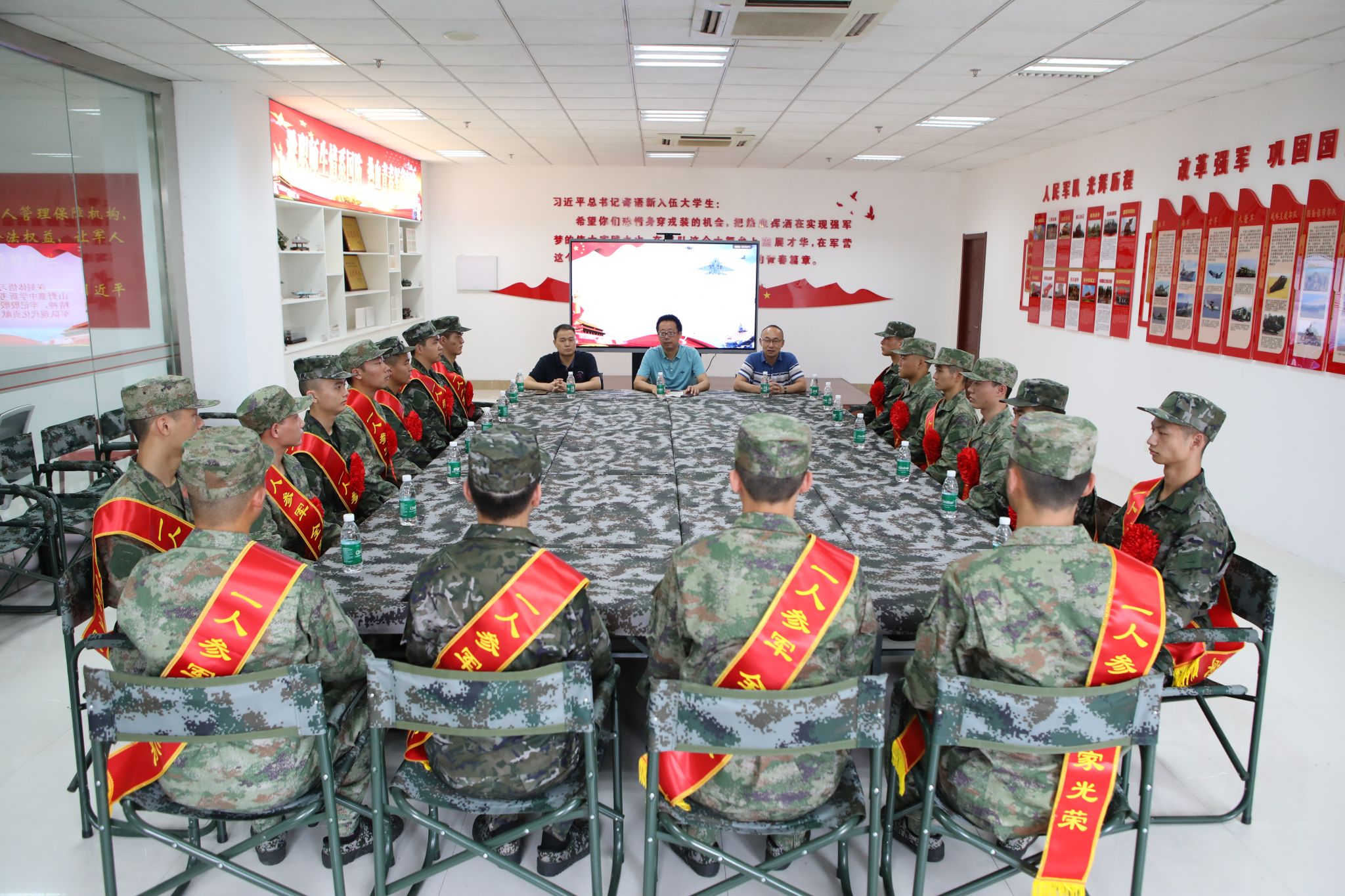 张军告诫新战士们要认真学习、深刻体悟习近平主席给安徽省潜山野寨中学新考取军校同学们的回信精神,牢记习近平主席殷殷嘱托,努力为国防和军队现代化贡献力量。要安心服役、刻苦训练,尽快成为一名合格的新时代“四有”军人,争取早立新功、早传捷报!