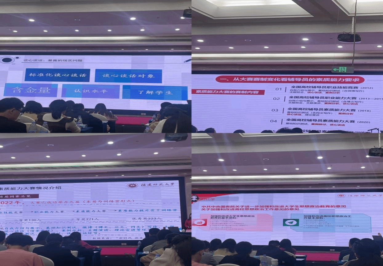 此次研修中,太阳集团tyc9728辅导员认真聆听学习了来自广东技术师范大学陈小花教授、沈阳工业大学党委学生工作部部长李青山等六名专家专题讲座。大家积极结合工作实际,围绕辅导员技能比赛的基础知识测试、案例研讨、谈心谈话等环节始终认真学习,拓宽视野,巩固和提升业务技能水平。