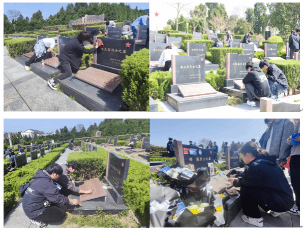 在烈士陵园,同学们组织有序地对烈士墓碑进行清洁。他们手持抹布、刷子等工具,认真细致地擦拭着每一块墓碑,清理墓碑周围的杂草和垃圾,让烈士安息地更加整洁、庄严。