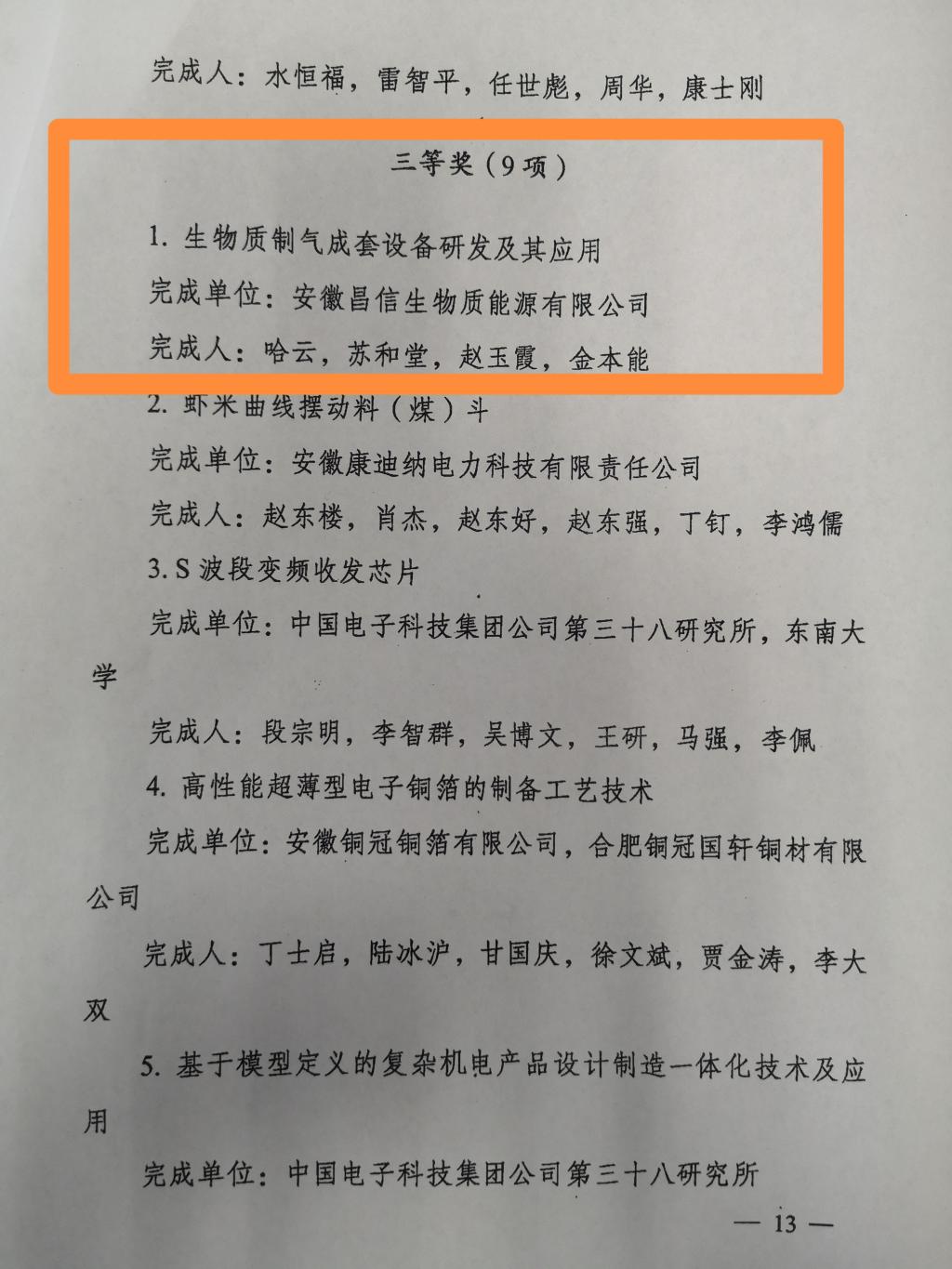 据悉,根据《安徽省科学技术奖励办法》规定,经省科学技术奖励评审委员会评审,省委、省政府批准,2019年度安徽省技术发明奖共授奖17项,授予“极端环境承压设备安全性能测试仪研发与应用”等3项成果安徽省技术发明奖一等奖;授予“便携非正交3D坐标测量系统研制及应用”等5项成果安徽省技术发明奖二等奖;授予“生物质制气成套设备研发及其应用”等9项成果安徽省技术发明奖三等奖。