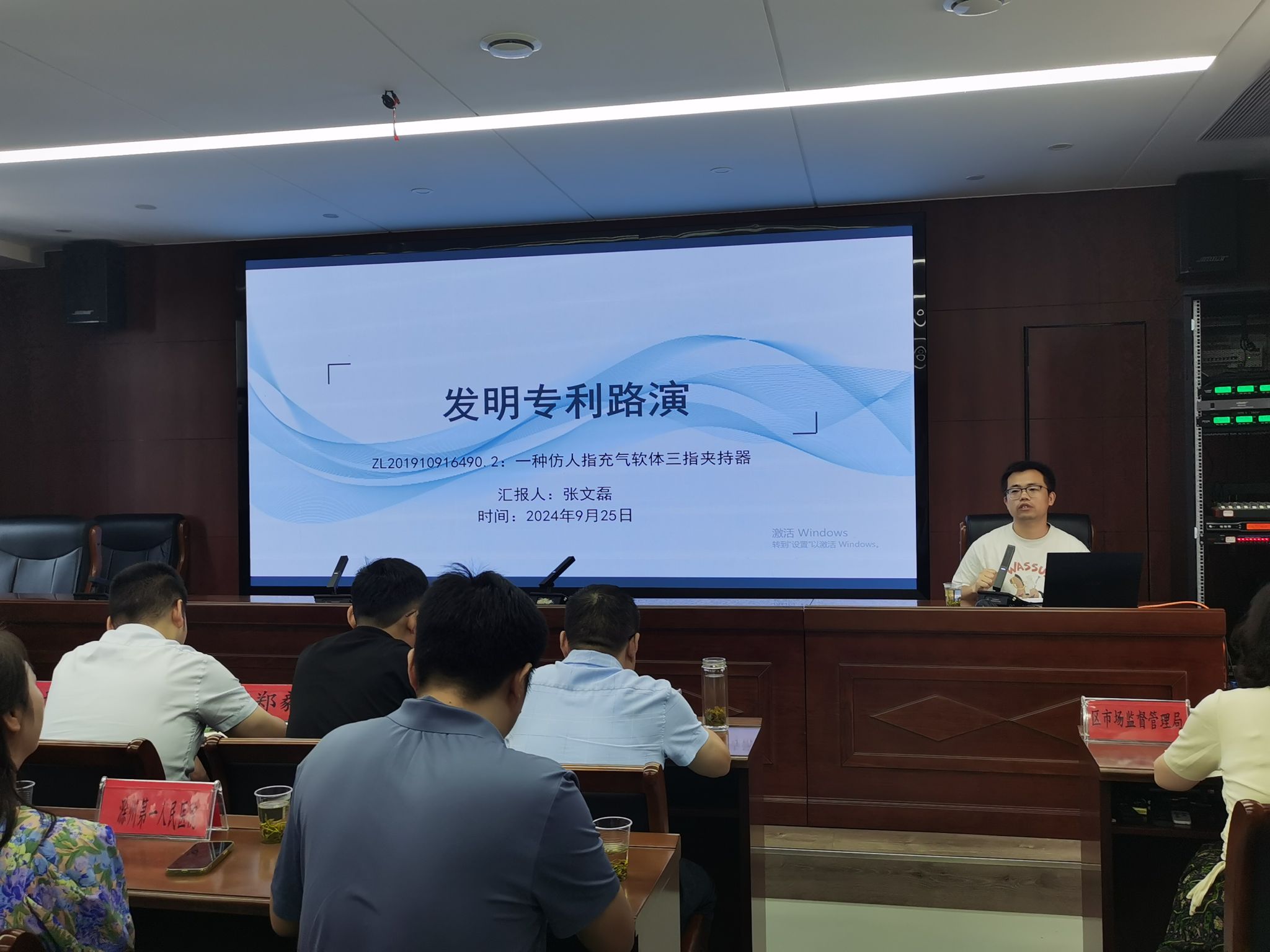 太阳集团tyc9728受邀参加本次活动,电气工程学院张文磊老师对其授权的2项发明专利“一种仿人指充气三指夹持器”和“一种基于主动包络的柔性气动夹持器”进行了推介路演。